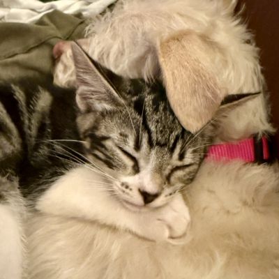 “Mak (formerly Mercury) is doing amazing! This little kitten blended into our family almost instantly. He loves playing with our dogs (both fellow SafeHaven adoptees!), and they absolutely adore him right back. The cuddle puddles are next-level adorable.