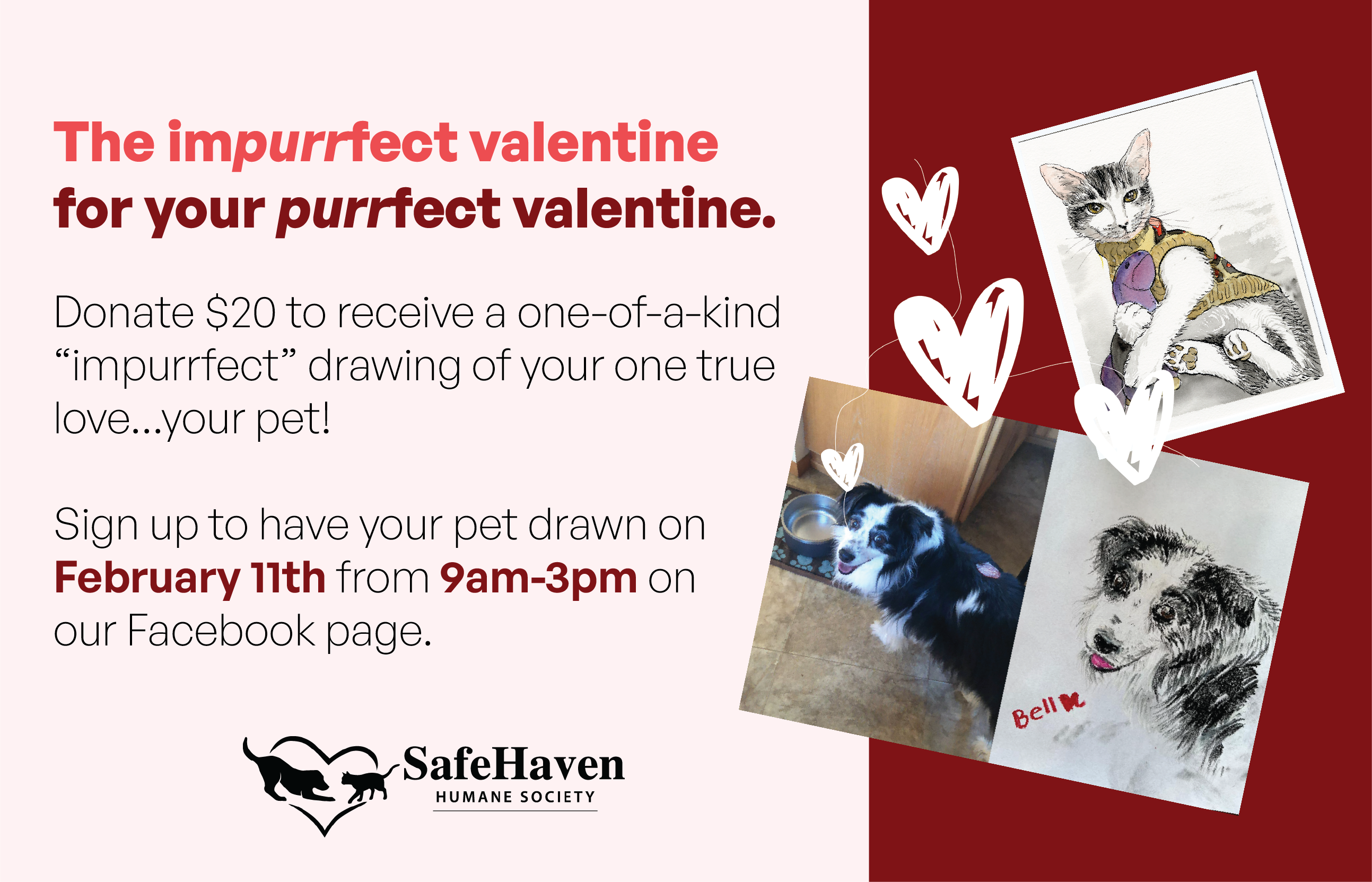 $20Our annual Pet Drawing Fundraiser is back on February 11th, just in time for Valentine’s Day! For a donation, you’ll receive an impurrfect drawing of your beloved pet. Will it be a masterpiece worthy of a gallery? Or a hilariously questionable work of art? Either way, every volunteer artist loves animals, and that’s what truly matters!