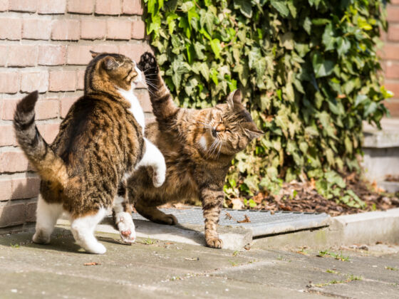 Intermale Aggression: Intact adult male cats tend to threaten, and sometimes fight with other males. These behaviors can occur as sexual challenges over a female. This type of aggression involves ritualized body posturing, stalking, staring, yowling, and howling. Attacks are usually avoided if one cat “backs down” and walks away. If an attack occurs, the attacker will usually jump forward, directing a bite to the nape of the neck, while the opponent falls to the ground on his back and attempts to bite and scratch the attacker’s belly with his hind legs. The cats may roll around biting and screaming, suddenly stop, resume posturing, fight again or walk away. Cats don’t usually severely injure one another this way, but you should always check for puncture wounds which are prone to infection.
